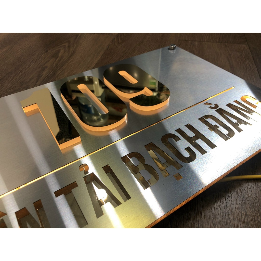 Biển Số Nhà. Có đèn LED Inox Vàng + inox xước, số nổi 10mm chân mica trong mặt inox vàng, ngoài trời. BSN-QC24H017