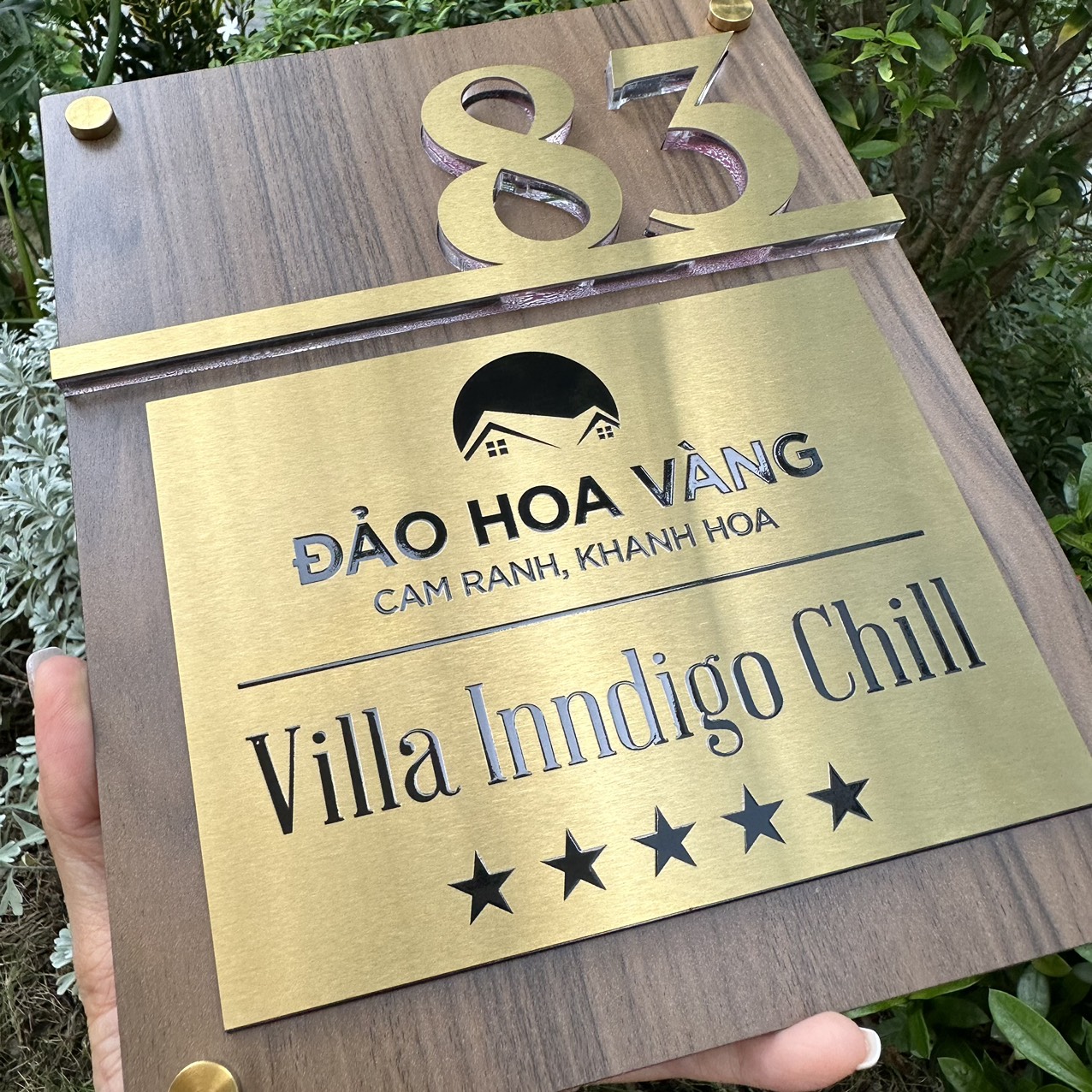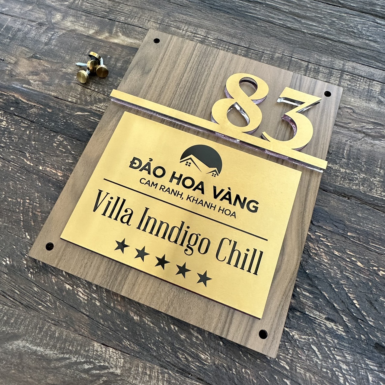 Biển Số Nhà. Nền Inox 304 vàng xước + Mica vân gỗ đậm. Nội dung số nổi + in UV, Cao cấp. BSN-QC24H016